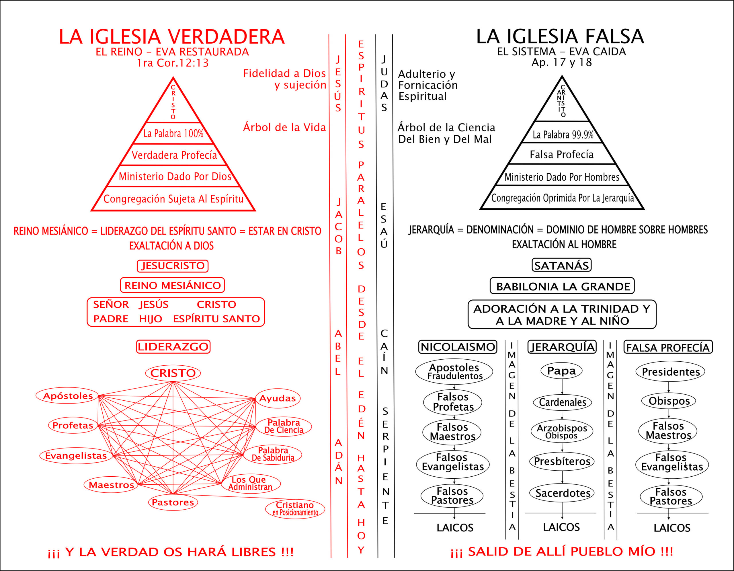 Desde el principio de la Creación hasta nuestros días han habido dos clases de iglesias: la Verdadera y la Falsa; son dos clases de ¨espíritus¨ debido a que hay dos ¨linajes¨ los cuales son los ¨hijos de Dios e hijos del Diablo¨, así los llamó Jesús lo cual también los mencionó como ¨ovejas y cabritos, hijos de la Luz e hijos de la Oscuridad, Trigo y Cizaña, Cristo y Anti Cristo, etc.¨